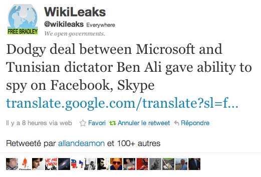 Remercions également au passage nos amis de Wikileaks, qui ont Tweeté par deux fois l’article de ce week-end. Forcément, avec plus d’un million de followers, le buzz a pris à l’international de façon spectaculaire. Les serveurs de Fhimt.com ont chauffé, mais gageons que notre hébergeur sera compréhensif, et pour cause : c’est OVH, qui avait également l’an dernier refusé de couper l’hébergement de Wikileaks, pourtant réclamé – sans la moindre base légale – par Eric Besson, ministre de l’Internet français, grand ami de la Tunisie (de Ben Ali) et de l’Internet (civilisé).